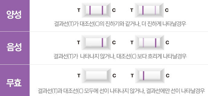 - 양성 : 테스트라인(T)과 대조라인(C) 모두 보이며, T라인이 더 진할 경우.