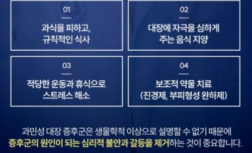 - 균형 잡힌 식사: 식이섬유가 풍부한 음식을 섭취하고, 트리거가 되는 음식은 피하는 것이 중요해요.