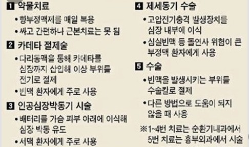 부정맥의 치료 방법은 여러 가지가 있어요. 약물 치료, 카데타절제술,인공심장박동기시술,제세동기수술등이 있습니다.
