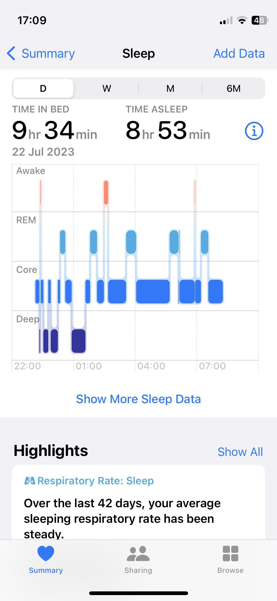 현재 다양한 스마트워치와 앱이 수면을 트래킹하는 기능을 제공합니다. 이러한 기기는 사용자의 움직임을 감지하고, 심박수 및 호흡수를 모니터링하여 수면의 질을 평가합니다. 예를 들어, 아래와 같은 앱은 수면 효율성과 각 수면 단계(REM, 깊은 수면, 가벼운 수면)를 한눈에 보여줍니다.