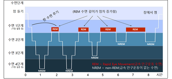 수면 트래킹을 통해 각 개인의 수면 상태를 파악하고, 개선이 필요한 부분을 찾아낼 수 있습니다. 예를 들어,아래와 같은 데이터는 사용자가 수면 중 어떤 단계에서 가장 많은 시간을 보내는지, 그리고 얼마나 자주 깨는지를 보여주어 개인 맞춤형 수면 개선을 가능하게 합니다.