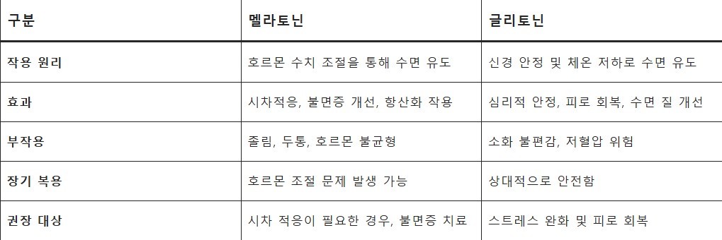 이처럼 멜라토닌은 직접적인 호르몬 보충제로서 수면을 강하게 유도하는 반면,글리토닌은 신경안정 및 편안한 이완을 통해 수면에 도움을 주는 방식이 다릅니다.