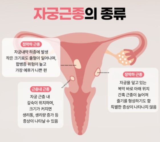 자궁근종의 크기와 위치에 따라 장막하, 점막하, 근층내 근종으로 나뉩니다. 자궁근종은 여성에서 매우 흔하게 발생하는 질병이며, 35세 이상의 여성의 40~50%에서 나타납니다. 다양한 증상이 나타날 수 있으며, 일부 여성들은 무증상인 경우도 있습니다.