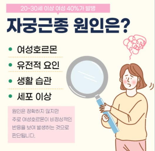 또한,호르몬(특히 에스트로겐과 프로게스테론)과 유전적 요인이 중요한 역할을 하는 것으로 알려져 있습니다. 후천적 요인으론 비만, 생활 습관, 스트레스 등이 자궁근종 발생 위험을 높일 수 있습니다.