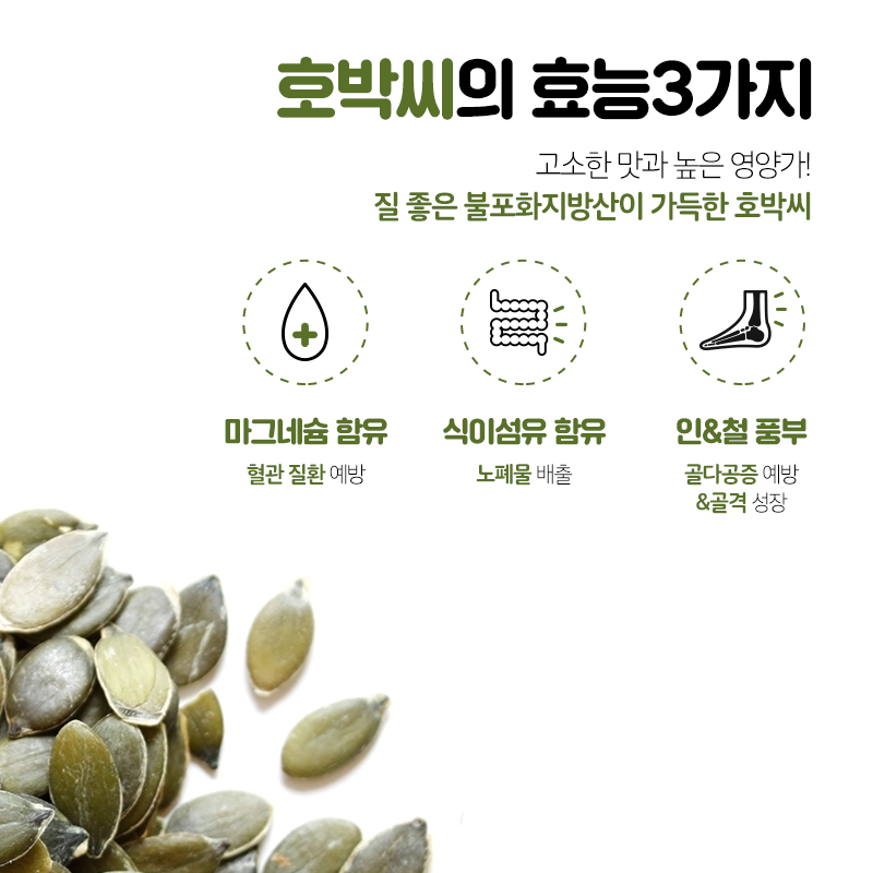 호박씨는 불포화지방산이 많아 심혈관 건강에 도움을 줄수 있으며,식이섬유 함량이 높아 소화건강에도 유익합니다.또한 단백질함량이 높아 근육을 유지하는데도 좋은 식품입니다